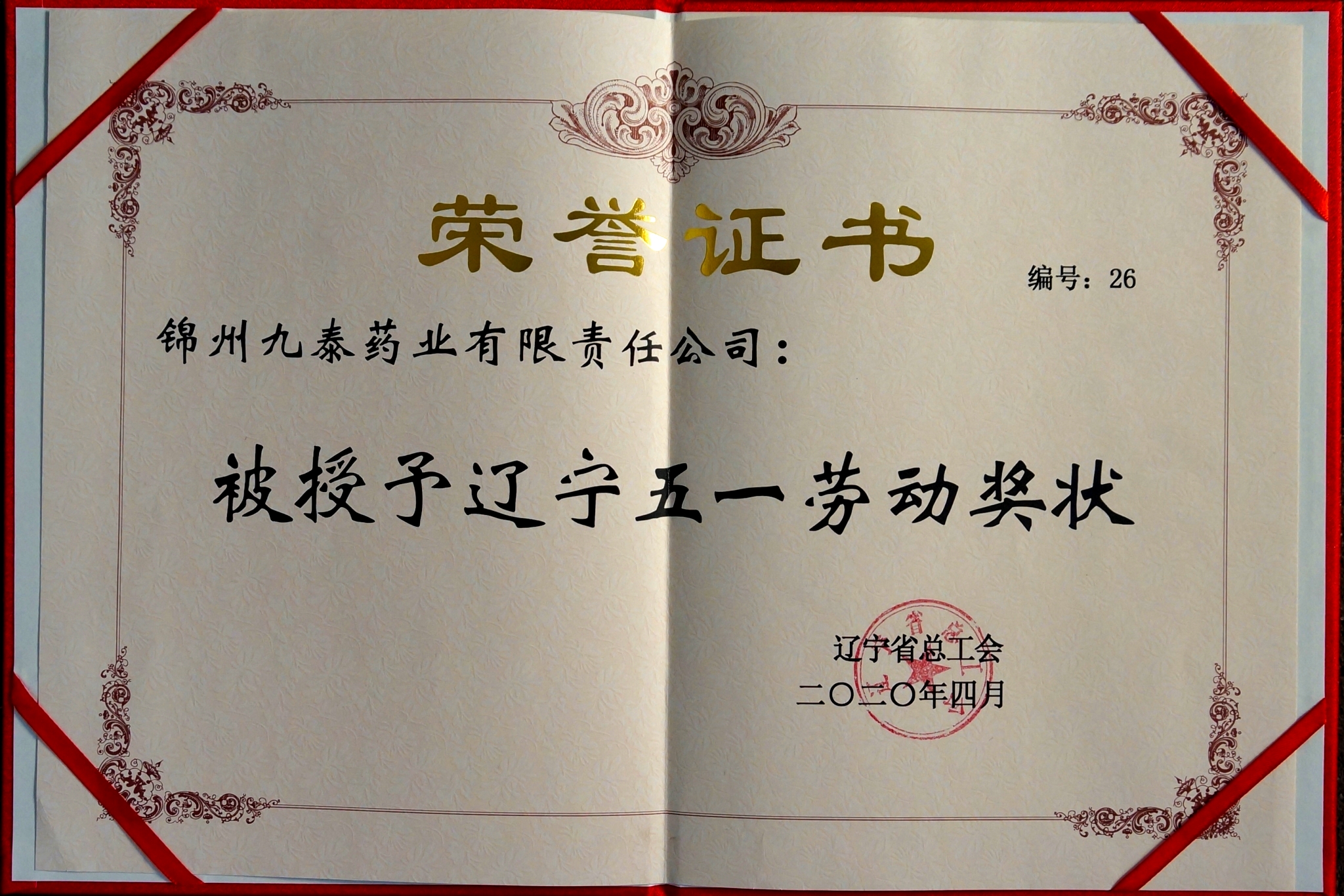 2020年4月,公司被遼寧省總工會授予“五一勞動獎狀”榮譽稱號。